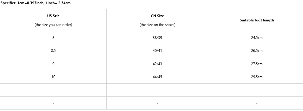 Sizes: US 8 (CN 38/39), US 8.5 (CN 40/41), US 9 (CN 42/43), US 10 (CN 44/45)